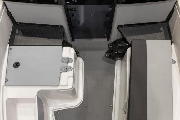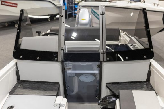 Hinter den beiden Konsolen mit einer zweiteiligen Mitteltür reisen bis zu drei Erwachsene komfortabel und geschützt vor Wind und Gischt. Das Boot wird von der Heckbank aus gesteuert. Vor den Konsolen befindet sich ein überraschend geräumiger, offener Bugbereich, der sowohl als zusätzliche Sitzgelegenheit als auch zum Transport von Ausrüstung dient. An der Vorderseite der Konsolen wurden praktische Trittstufen angebracht, darunter befindet sich praktischer Stauraum für Fender. Die Konsolen verfügen außerdem über praktische Staufächer für kleinere persönliche Gegenstände.