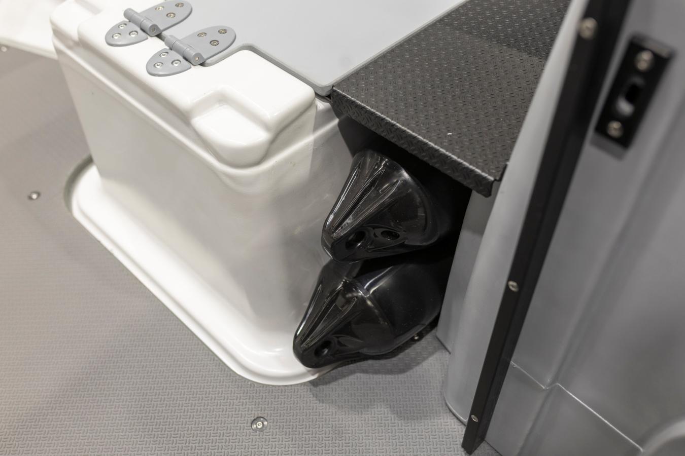 Hinter den beiden Konsolen mit einer zweiteiligen Mitteltür reisen bis zu drei Erwachsene komfortabel und geschützt vor Wind und Gischt. Das Boot wird von der Heckbank aus gesteuert. Vor den Konsolen befindet sich ein überraschend geräumiger, offener Bugbereich, der sowohl als zusätzliche Sitzgelegenheit als auch zum Transport von Ausrüstung dient. An der Vorderseite der Konsolen wurden praktische Trittstufen angebracht, darunter befindet sich praktischer Stauraum für Fender. Die Konsolen verfügen außerdem über praktische Staufächer für kleinere persönliche Gegenstände.